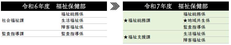 重層的支援など、横断的な業務を担う「福祉総務課」と、生活保護や障がい者福祉など、現場に直結した実務を担う「福祉支援課」に再編。