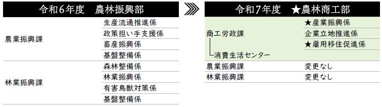資材高騰、人材確保など産業に共通する課題に対応し、産業を総合的に振興する。商工業への支援と経営創業への支援を一体的に行うため、係を統合。特に、移住者に対し、移住と雇用を一体的に支援するため、係を統合。