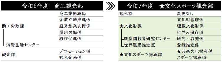 日田の魅力をさらに発信するため、文化財の保護活用、芸術、スポーツの振興を教育委員会から市長部局に移し、一体的に振興する。部の再編に伴い、社会教育課文化振興係を移管し、課・係の名称を変更。