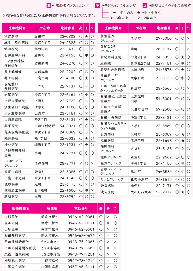 大分県外の医療機関(上の表に記載している県外の医療機関を除く)で、高齢者インフルエンザ及び新型コロナウイルス感染症の予防接種を受けたい場合は、個別の手続が必要です。下記にお問い合わせください。