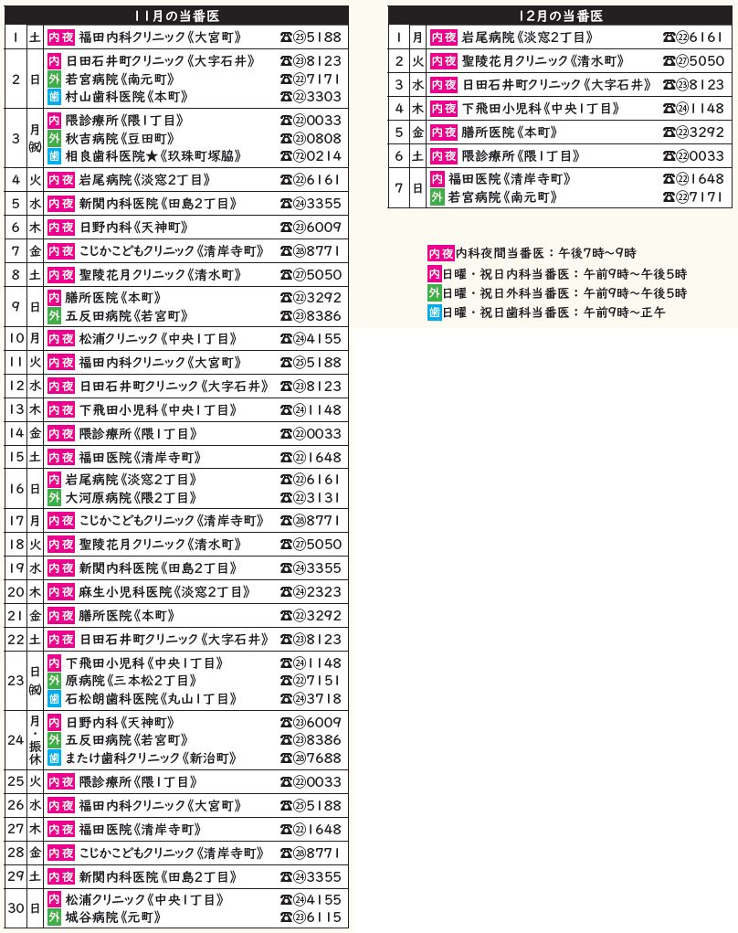 日程を変更することがありますので、医療機関には事前に電話で確認してください。又は市役所【電話】23-3111、夜間・日曜・祝日当番医案内【電話】23-0099(午後5時以降、自動音声案内)にお問い合わせください。また、当番医は急患に限ります。往診はしません。