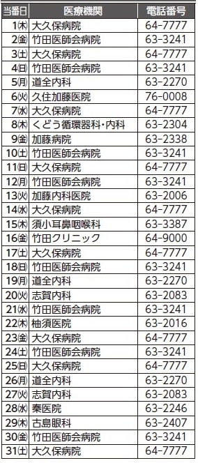 ※当番医院の情報については、変更になる場合があります。最新の情報は、ケーブルテレビのデータ放送「休日当番医」をご覧いただくか、竹田市消防署(【電話】63-0119)でも確認できます。