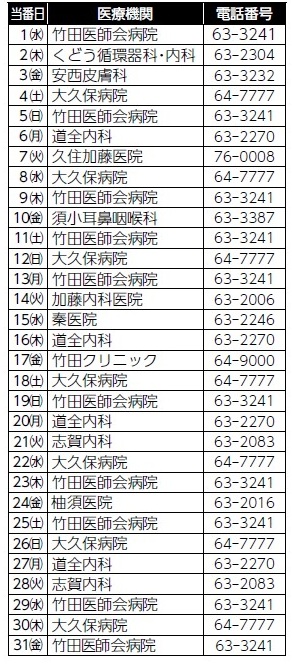 ※当番医院の情報については、変更になる場合があります。最新の情報は、ケーブルテレビのデータ放送「休日当番医」をご覧いただくか、竹田市消防署(【電話】63-0119)でも確認できます。