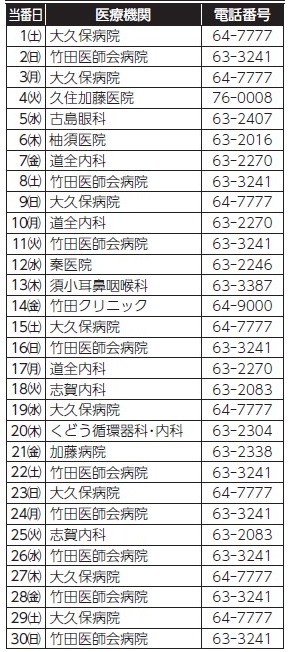 ※当番医院の情報については、変更になる場合があります。最新の情報は、ケーブルテレビのデータ放送「休日当番医」をご覧いただくか、竹田市消防署(【電話】63-0119)でも確認できます。