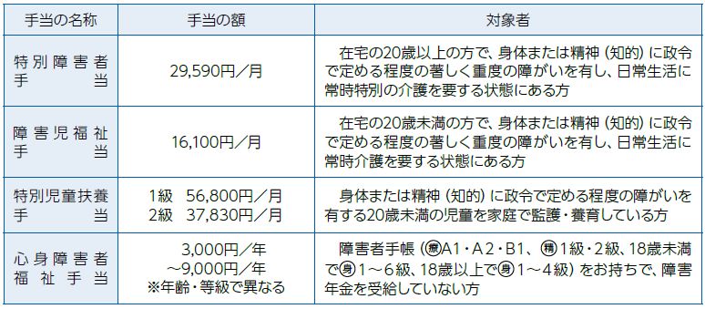 障がいのある方の生活を支援するため、下表のような手当があります。