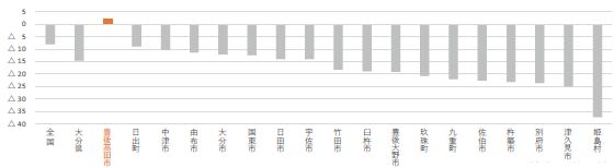 図(1)大分県内各市の若年女性人口(20~39歳)の増減率(令和2年ー平成27年)