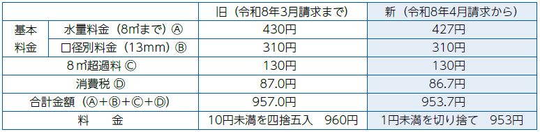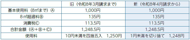 料金システムの変更に伴い、消費税額がより明確にわかる料金体系に改定します。これに伴い、令和8年4月の請求分から、水道と下水道の料金等を以下のとおり変更します。ご理解とご協力をお願いします。