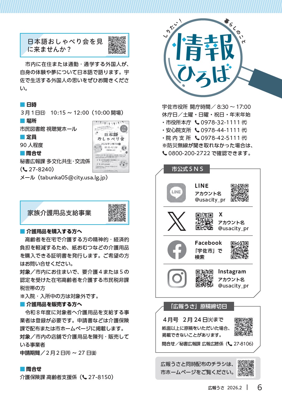 くらし 広報うさ 令和8年2月号 P.6 6/24 前の記事 次の記事 発行日 : 2026年01月25日 自治体名 : 大分県宇佐市 広報紙名 : 広報うさ 令和8年2月号 Tweet シェアする 広報うさ 令和8年2月号 P.5 広報うさ 令和8年2月号 P.7