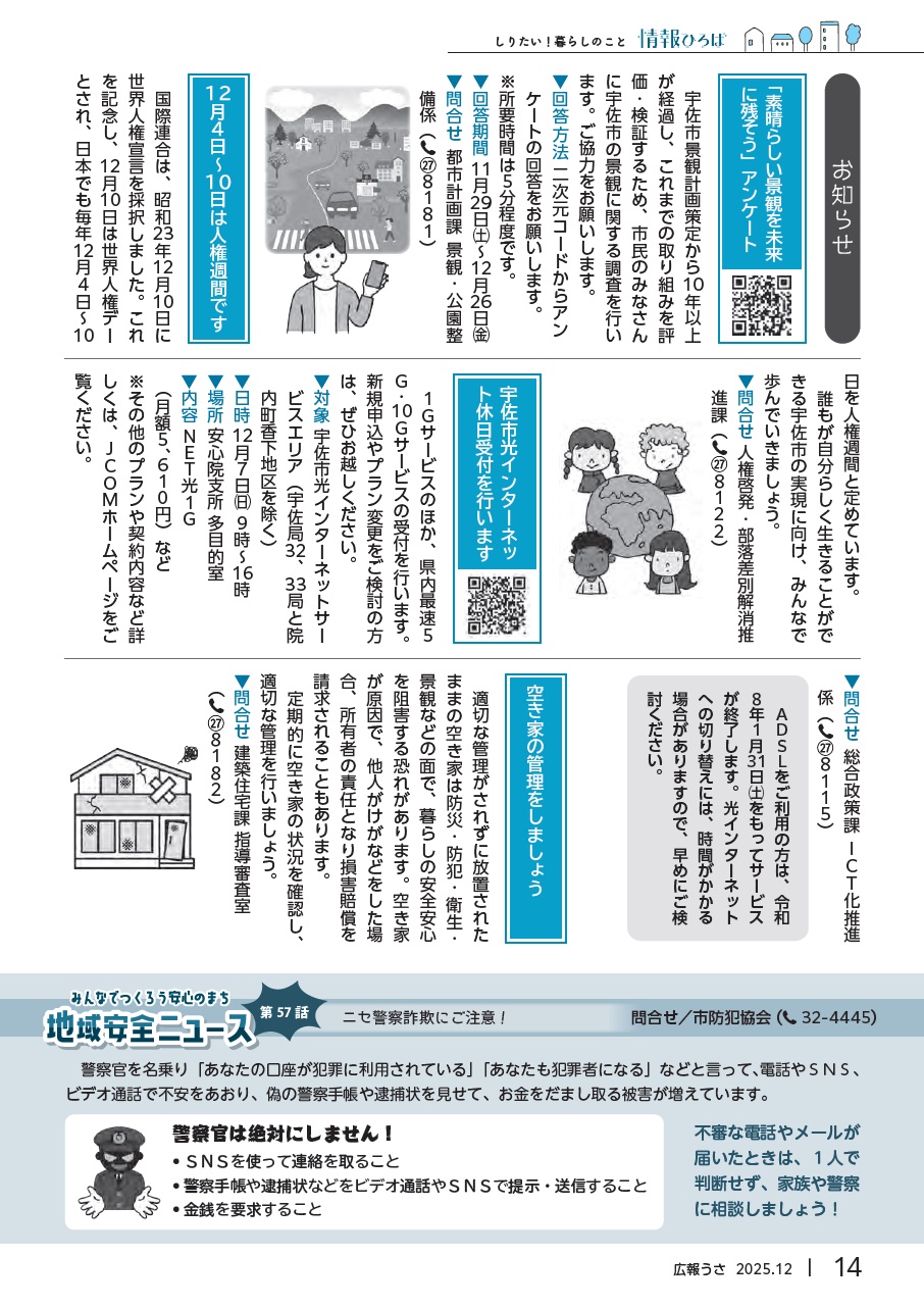 くらし 広報うさ 令和7年12月号 P.14 14/26 前の記事 次の記事 発行日 : 2025年11月25日 自治体名 : 大分県宇佐市 広報紙名 : 広報うさ 令和7年12月号 Tweet シェアする 広報うさ 令和7年12月号 P.13 広報うさ 令和7年12月号 P.15