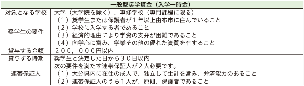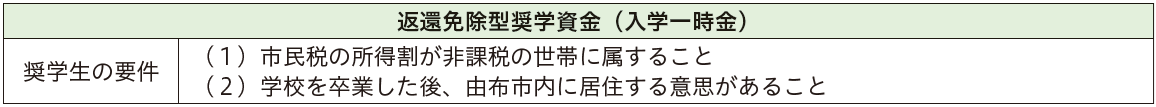また、由布高等学校を卒業して大学等へ進学する方は、非課税の世帯に属していなくても学校を卒業した後、由布市内に居住する意思があれば返還免除型奨学資金の申し込みをすることができます。