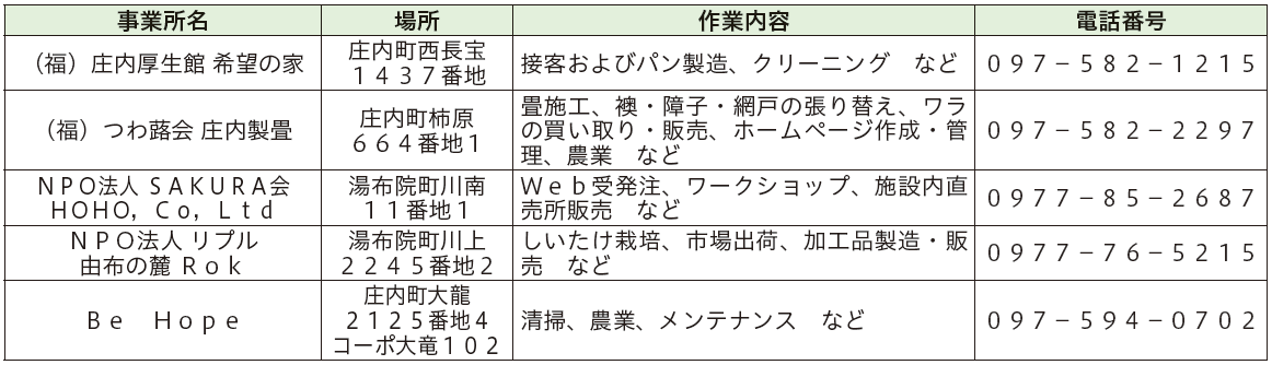 次の就労支援事業所では、障がいのある方などに、一般企業などで働くための必要な知識やスキルの向上のために必要な訓練を行っています。就労支援事業所を利用するためには、要件があります。詳しくは福祉課にお問い合わせいただくか、由布市公式ホームページをご覧ください。