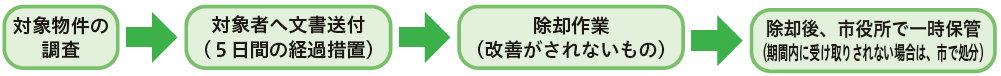 上記の禁止広告物や禁止物件への掲示に該当する場合、市から設置者に対して自主除却もしくは改善を依頼する文書を送付します。その後、改善がされていない物件については、市が除却し一時保管を行います。