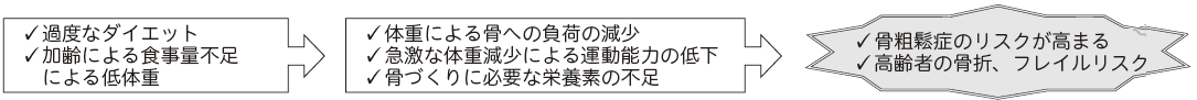 今年の年間テーマは「骨コツ健康づくり~健康寿命延伸のために~」です。骨折や転倒を予防するための生活のポイントを毎月お話しています。今月は「若年者のダイエット、高齢者の低体重が骨へ与える影響」についてお伝えします。