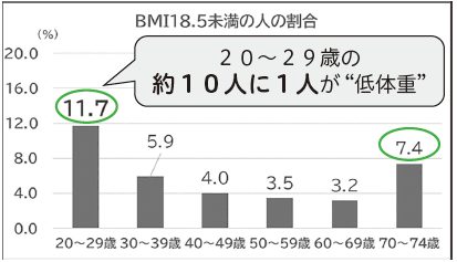 “低体重”はさまざまな健康障害を招くだけでなく、骨に対しても悪い影響を与えてしまいます。由布市では、どれくらい“低体重”の人がいるのでしょうか?