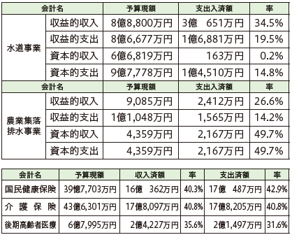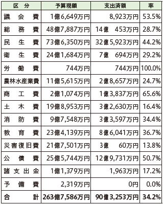 令和7年度の一般会計予算額は、年度当初、246億383万円でしたが、その後、物価高騰対策や令和6年台風10号災害に対応する事業などの補正予算措置を行い、現在、263億7,586万円となっています。この予算額に対する収入済額は97億7,237万円(収入率37.1%)、支出済額は90億3,253万円(執行率34.2%)となっています。