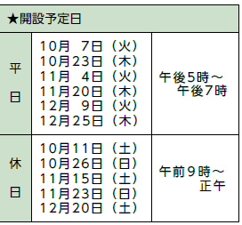 マイナンバーカードの申請及び交付についての時間外窓口を下記の日程で開設します。事前にご予約のうえ、ぜひご利用ください。