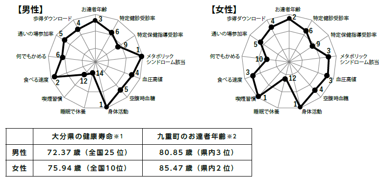 大分県では男女ともに健康寿命日本一を目指すため、健康指標を用いて、各市町村の現状を「見える化」し、市町村毎のランキングを毎年公表しています。九重町では「睡眠で休養」「喫煙(男性)」「歯の健康(女性)」に課題(グラフの数字は県内順位)があります。県内1位を維持できるように、ご家族や地域ぐるみで健康づくりに取り組みましょう。