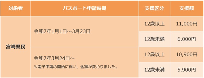 令和7年1月1日以降にパスポートを取得し、宮崎空港発着の国際線を利用(片道利用を含む)した全ての宮崎県民を対象に、パスポート取得費用(※5年用なら全額)を支援します!