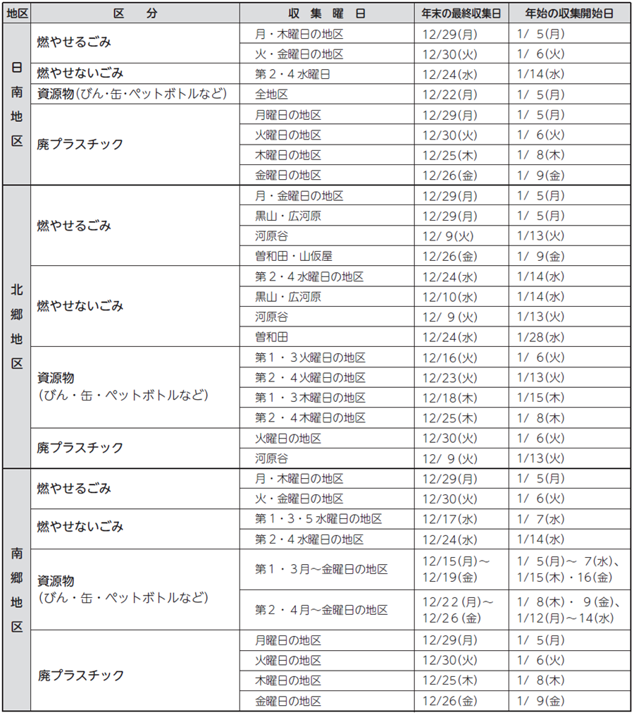 ※最終収集日の翌日から収集開始日の前日までは、収集を行いません。この期間は、ごみや資源物をステーションや資源集積所などに出さないでください。