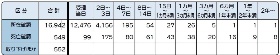 令和6年中に所在確認などができた認知症の行方不明者(確認をした年次以前に受理した届出分を含む)のうち、届出受理から所在確認までの期間は、受理当日が最も多く12,476人、次いで2日~3日以内の4,156人でした(死亡確認、その他を除く)。