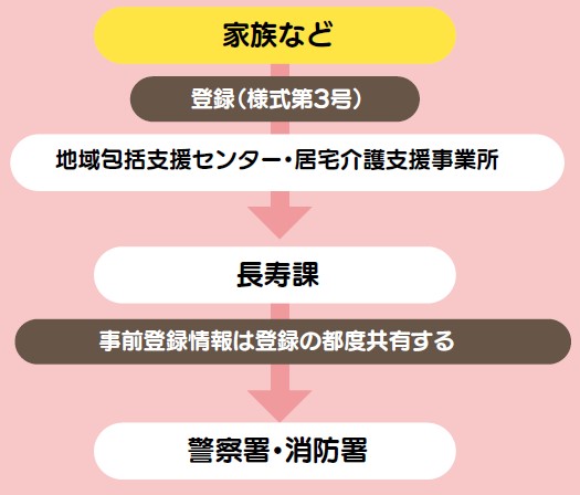 (1)事前に登録した情報を整理し、関係者間(長寿課、警察署、消防署、地域包括支援センター)で共有しておくことで、日頃からの見守りにつながります。