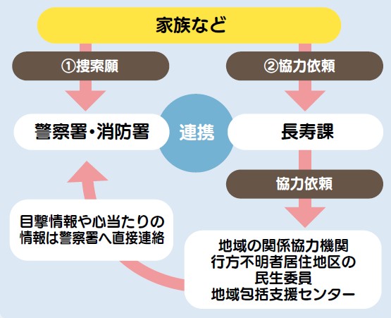 認知症高齢者などが行方不明になったとき、警察や消防だけでなく地域の関係機関・事業所が協力して、速やかに行方不明者を発見し保護する仕組みです。ネットワークを利用するには登録が必要です。最寄りの地域包括支援センター、または長寿課にお問い合わせください。