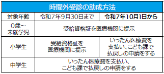 小学生以上の人が時間外に医療機関を受診する場合、いったん医療費を支払い、こども課で払戻しの申請をしていただく方法に変わります。(県外で受診する場合と同じ方法です。)