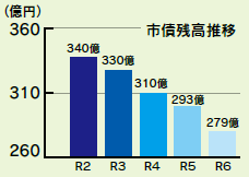 世代間負担の公平性や財政支出の平準化の観点から、公共施設整備や災害復旧などの財源の一部を市債で賄っており、令和6年度末の残高は278億7,152万円(前年度比14億4,152万円減)となりました。