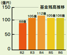 突発的な支出や経済状況の変動等に対応するための基金や公共施設の整備、地域振興など特定の目的に限って使える各種基金があります。令和6年度末の残高は、お倉ヶ浜総合公園野球場整備等による基金の取崩しが増加したものの、ふるさと日向市応援寄附金の受入額の増による積立額の増加により105億5,679万円(前年度比5,086万円増)となりました。