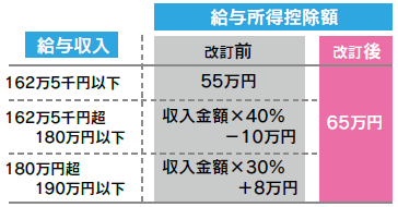 給与収入が190万円以下の方に適用される給与所得控除額が65万円に引き上げられました。