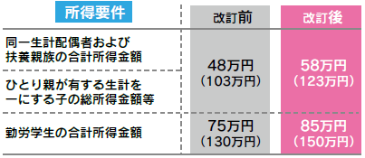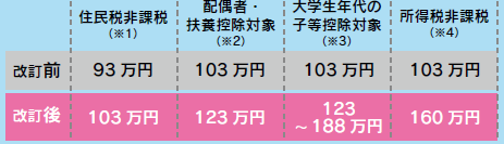 配偶者控除・扶養控除について、対象となる扶養親族・同一生計配偶者の合計所得金額にかかる要件が48万円(給与収入103万円に相当)から58万円(給与収入123万円に相当)に引き上げられました。
