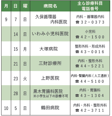 くらし さいとカレンダー〔休日在宅医〕 20/24 前の記事 次の記事 発行日 : 2025年09月01日 自治体名 : 宮崎県西都市 広報紙名 : 広報さいと 2025年9月号 休日在宅医は変更になることがあります。 事前に電話でご確認ください。 ※休日在宅医はテレビでもご確認いただけます。 NHK総合(1チャンネル)のデータ放送をご覧ください。 Tweet シェアする 人の動き さいとカレンダー〔相談・その他〕