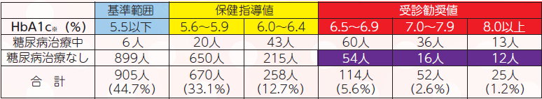健診受診者のHbA1c値を見てみると、受診勧奨値であったが糖尿病の治療をされていない方が82人いました。健診を受けることで高血糖の状態に気付くことができた方々です。なお、HbA1c7.0以上であった方々には、市の保健師・管理栄養士が医療機関への受診を勧めています。