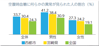 西都市は宮崎県や全国と比較して血糖値が高い状況です。