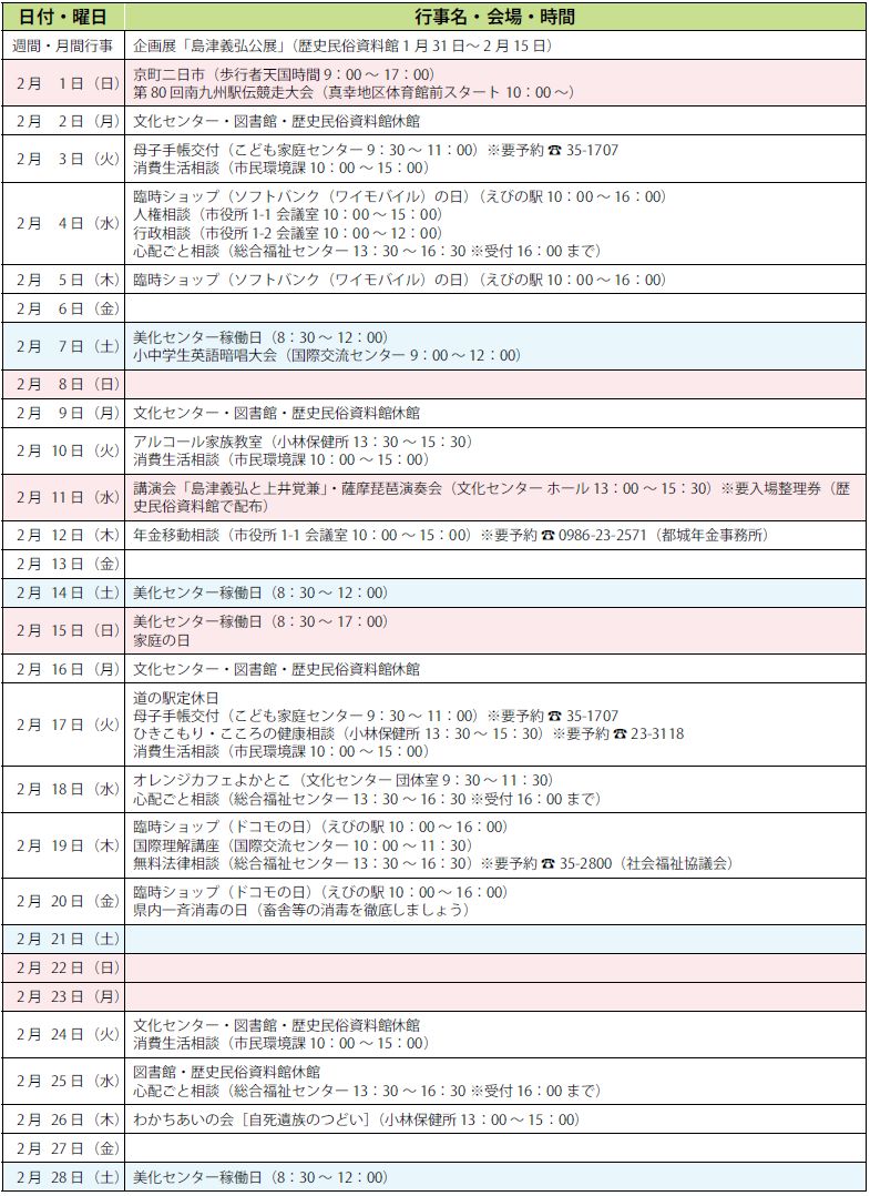 くらし 2月の行事予定 21/22 前の記事 次の記事 発行日 : 2026年01月20日 自治体名 : 宮崎県えびの市 広報紙名 : 広報えびの 令和8年1月号 ※各行事については、変更になる場合があります。 Tweet シェアする 今月の表紙・今月の納税・人口・世帯数・Editor’s その他のお知らせ(広報えびの 令和8年1月号)