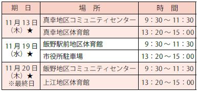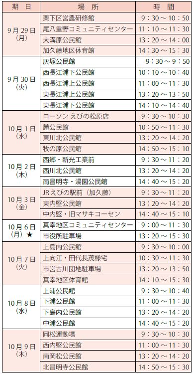 日程表の「★」の日程は、リフト付き検診車で検診を行います。リフト付き検診車では、車いすから検診専用の車いすに乗り換えて撮影ができます。通常の検診車での検診が困難な人は、ぜひ、この日をご利用ください。