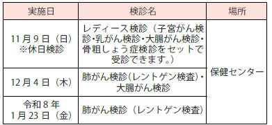 ※子宮がん検診と乳がん検診、骨粗しょう症検診は、対象年齢があります。詳細は、市健康保険課市民健康係にお問い合わせください。