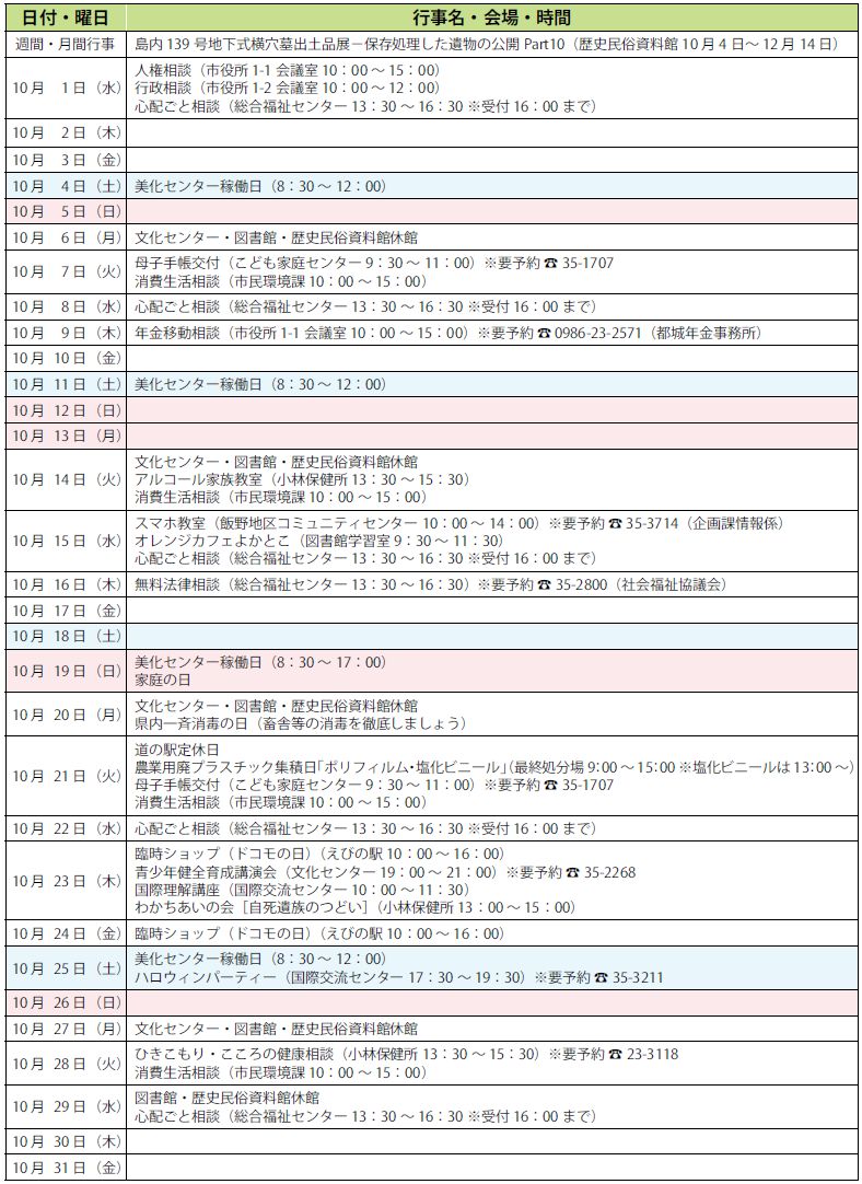 くらし 10月の行事予定 34/35 前の記事 次の記事 発行日 : 2025年09月20日 自治体名 : 宮崎県えびの市 広報紙名 : 広報えびの 令和7年9月号 ※各行事については、変更になる場合があります。 Tweet シェアする 今月の表紙・今月の納税・人口・世帯数・Editor’s その他のお知らせ(広報えびの 令和7年9月号)