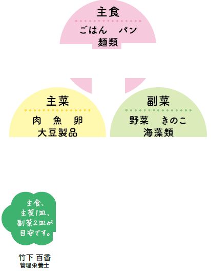 毎食、ごはん・パン・麺類などのエネルギー源となる「主食」、肉・魚・卵・大豆製品などのタンパク質が多い「主菜」、野菜・きのこ・海藻類などのビタミン・ミネラル・食物繊維が多い「副菜」をそろえることで、1日に必要な栄養をとることにつながります。