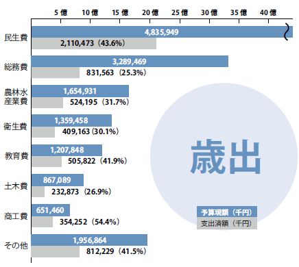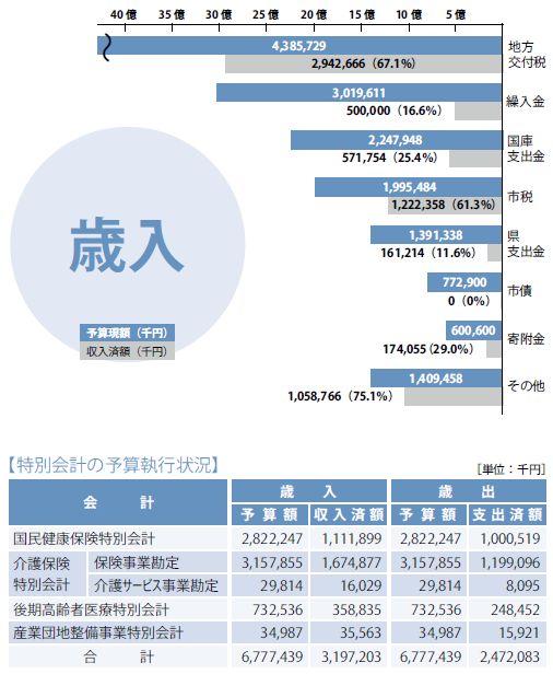 この合計額に対して、9月30日現在の収入済額は、66億3081万3千円で収入済率41・9%、支出済額は、57億8057万円で支出済率36・5%となっています。
