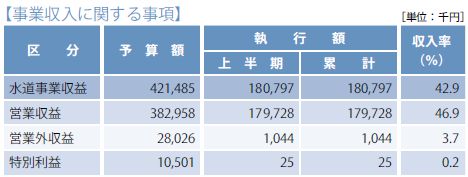 収入の営業収益は、水道料金、手数料、水道加入金など。営業外収益は、受取利息および配当金など。