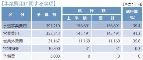 支出の営業費用は、原水および浄水費、配水および給水費、総係費、減価償却費など。営業外費用は、企業債の償還利息など。