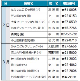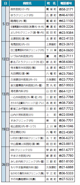 ※休日急患診療機関の診療時間は午前9時〜午後6時です。やむを得ず変更する場合がありますので、【電話】23-5555で確認してください(夜間は都城夜間急病センター【電話】36-8890まで)。なお歯科については【電話】25-4100にお問い合わせください。