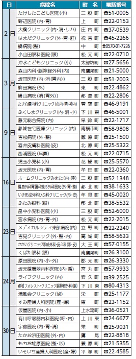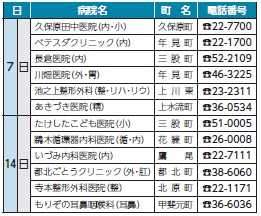 ※休日急患診療機関の診療時間は午前9時〜午後6時です。やむを得ず変更する場合がありますので、【電話】23-5555で確認してください(夜間は都城夜間急病センター【電話】36-8890まで)。なお歯科については【電話】25-4100にお問い合わせください。