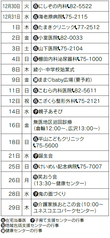 年末年始は、休日在宅医となる医療機関が混雑する恐れがあります。罹患した場合や体調を崩した場合に備え、各家庭で必要なものの準備をお願いします。また、休日在宅医は変更になる可能性があります。事前に医療機関に診療科目や受付時間を確認したうえで受診してください。宮崎市郡医師会ホームページの休日在宅医ページは二次元コードを読み取るとご覧になれます。