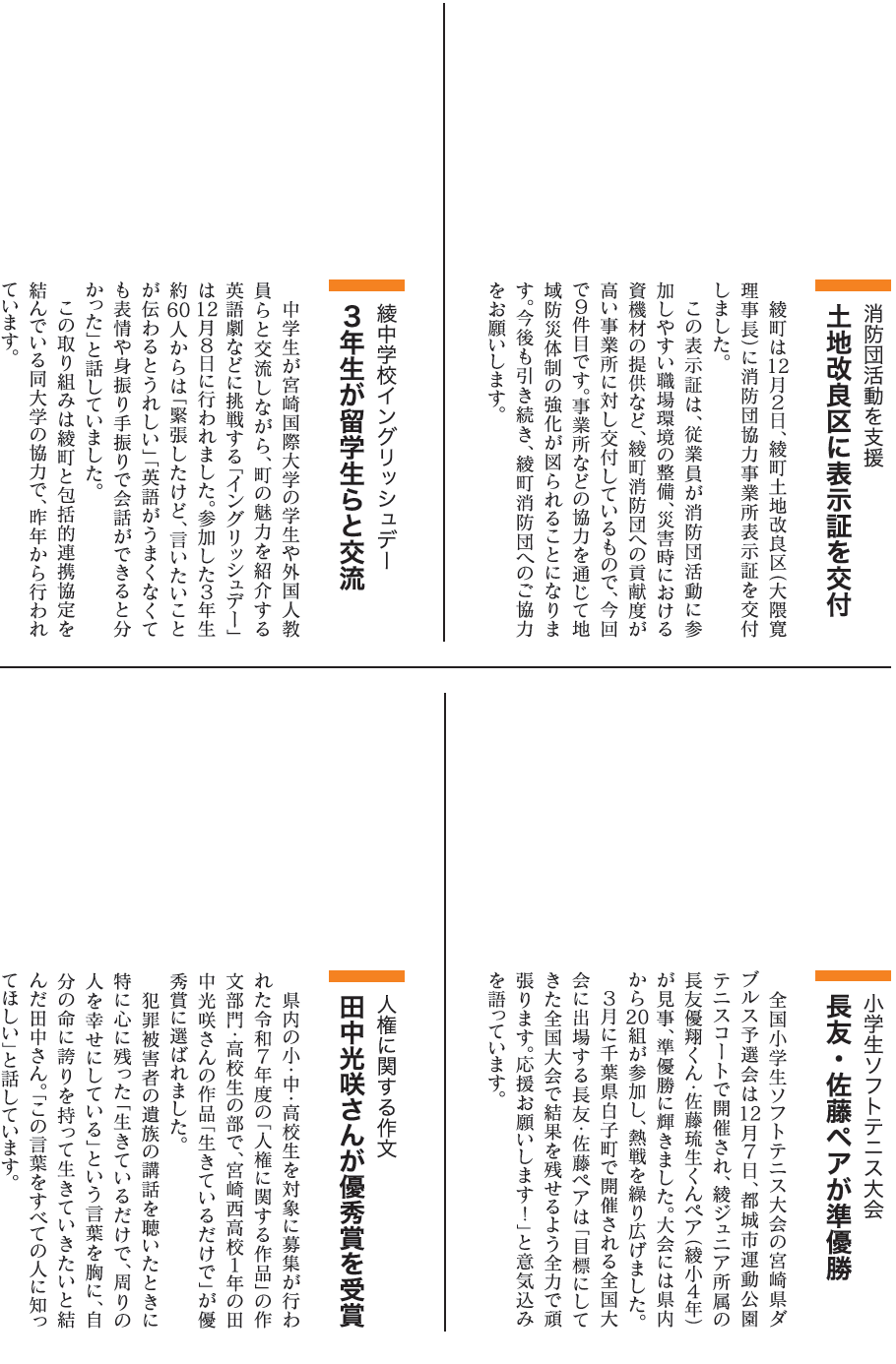 くらし まちの話題 16/17 前の記事 次の記事 発行日 : 2026年01月26日 自治体名 : 宮崎県綾町 広報紙名 : 広報あや 2026年2月号(288号) ※詳しくは広報紙P14.15をご覧ください。 Tweet シェアする くらしの情報(2月)-寄付- その他のお知らせ(広報あや 2026年2月号(★号))