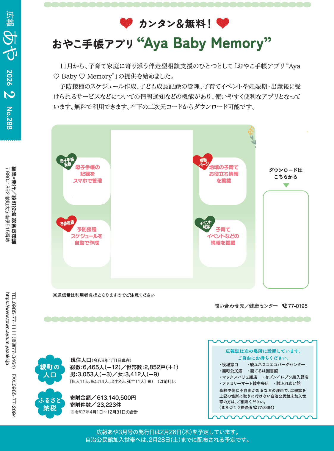 その他 その他のお知らせ(広報あや 2026年2月号(★号)) 17/17 前の記事 発行日 : 2026年01月26日 自治体名 : 宮崎県綾町 広報紙名 : 広報あや 2026年2月号(288号) ※詳しくは広報紙巻末をご覧ください。 Tweet シェアする まちの話題