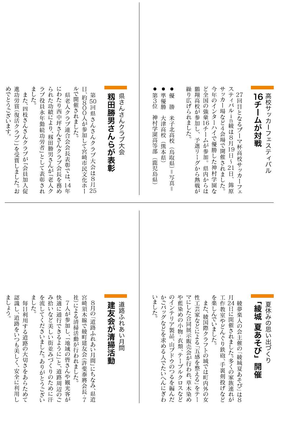 くらし まちの話題 16/19 前の記事 次の記事 発行日 : 2025年09月26日 自治体名 : 宮崎県綾町 広報紙名 : 広報あや 2025年10月号(284号) ※詳しくは広報紙P14をご覧下さい。 Tweet シェアする 10/26(日)照葉樹林 綾マラソン ユネスコエコパーク通信