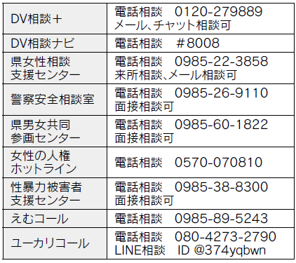 毎年11月12日~25日に全国で行われる運動です。配偶者や交際相手からの暴力に悩んでいませんか。DVは殴る・蹴るなどの身体的な暴力だけでなく、怒鳴る・無視するといった精神的暴力、性的暴力、生活費を渡さないなどの経済的暴力、交友関係などを監視するといった社会的暴力、子どもを巻き込んだ暴力も含まれます。さまざまな無料相談窓口が開設されています。まずはご相談ください。