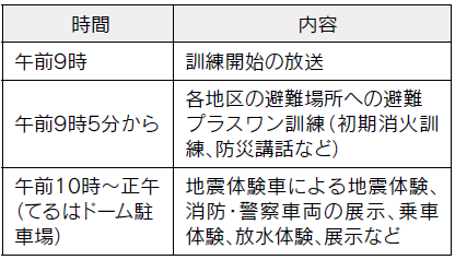大規模地震の発生に備え総合防災訓練を実施します。午前9時に訓練開始の放送を行います。皆さんの参加をお願いします。